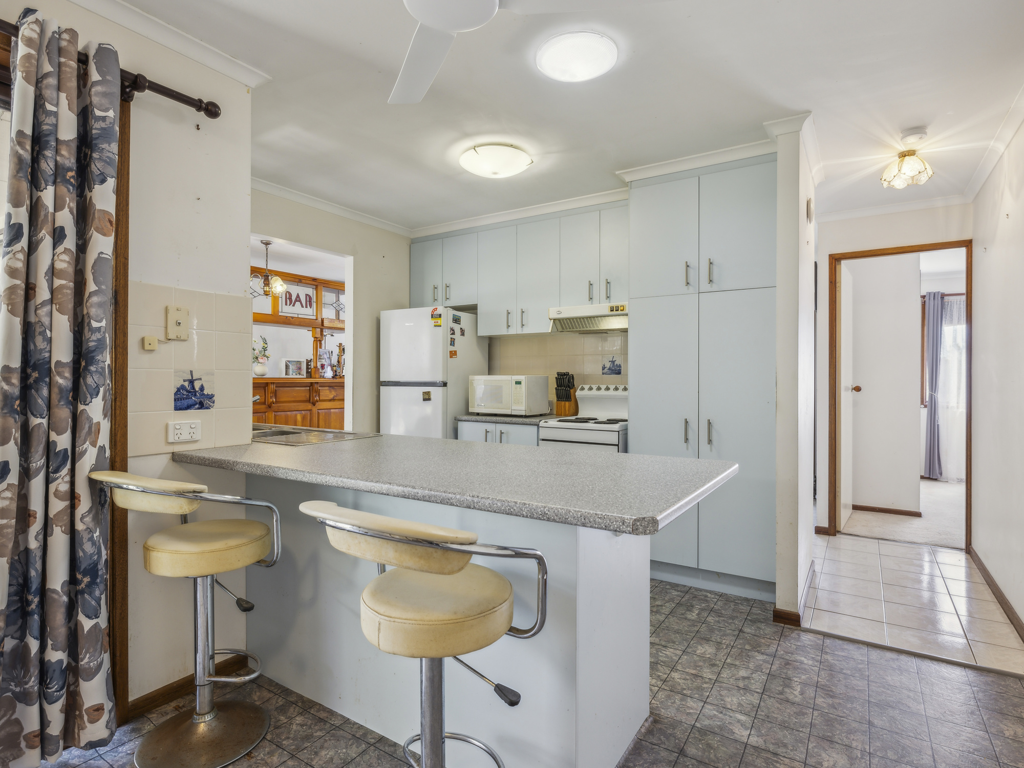 The heart of the home is its open plan kitchen and dining area, perfect for family meals and entertaining guests. The kitchen is equipped with all the essentials, making meal preparation a breeze, as well as a brekky bar that well utilises the space. Adjacent to the dining area, you'll find a laundry with external access for added practicality.